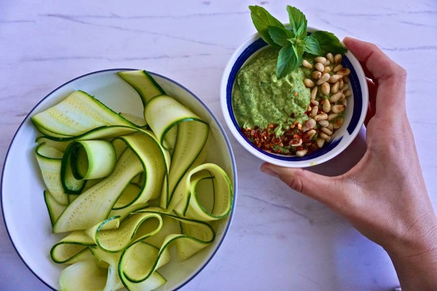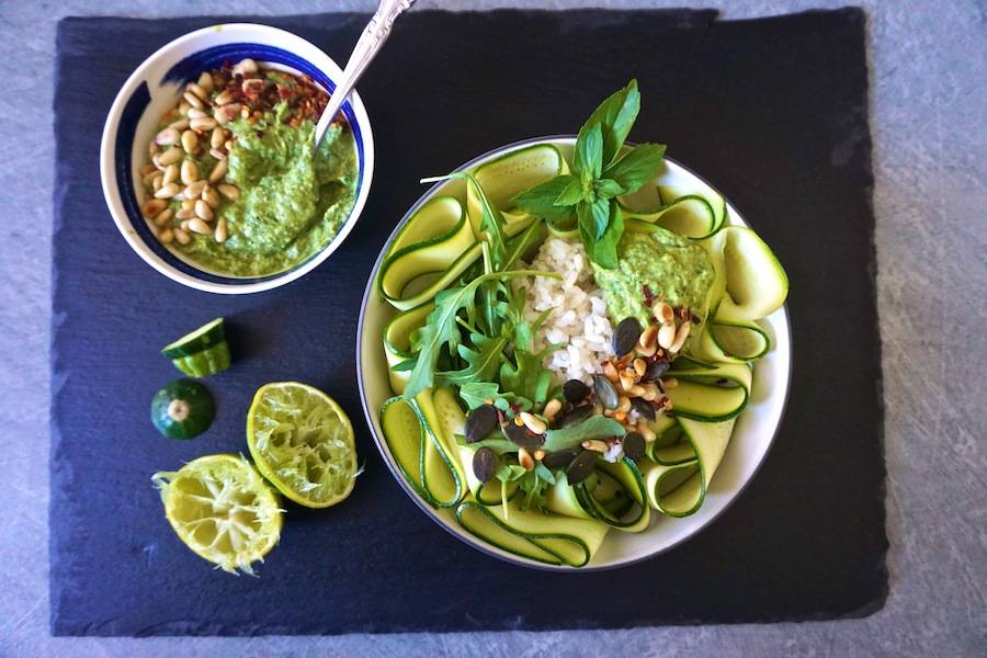 To get a little more creative, make a green Buddha bowl with a base of rice or quinoa; some spiralised or ribboned vegetables (such as zucchini); green leaves (like extra rocket or baby spinach); a sprinkling of nuts and seeds and a big scoop of pesto in the middle. YUM!