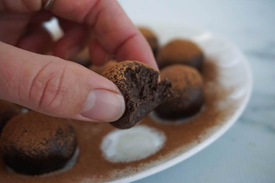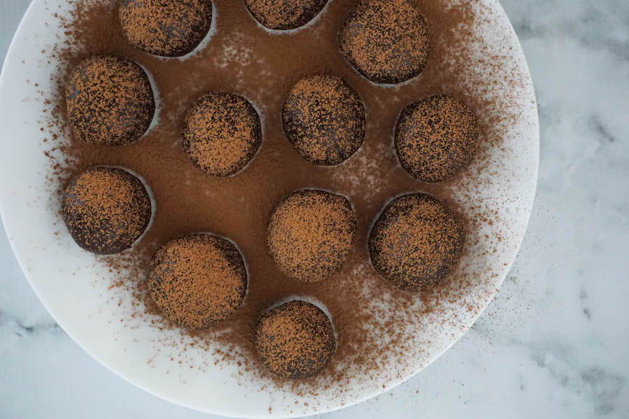4. Place truffles on a plate and dust extra cacao over them using a fine tea strainer or colander