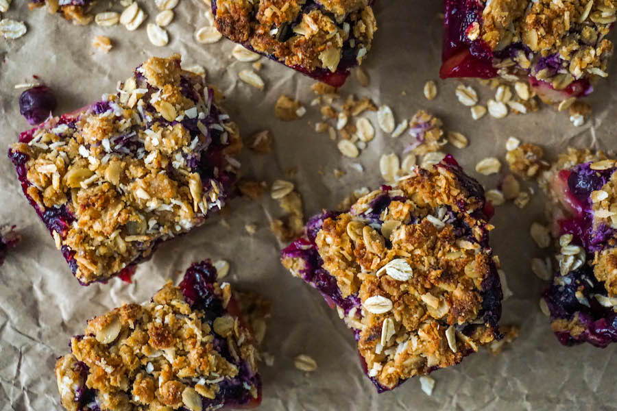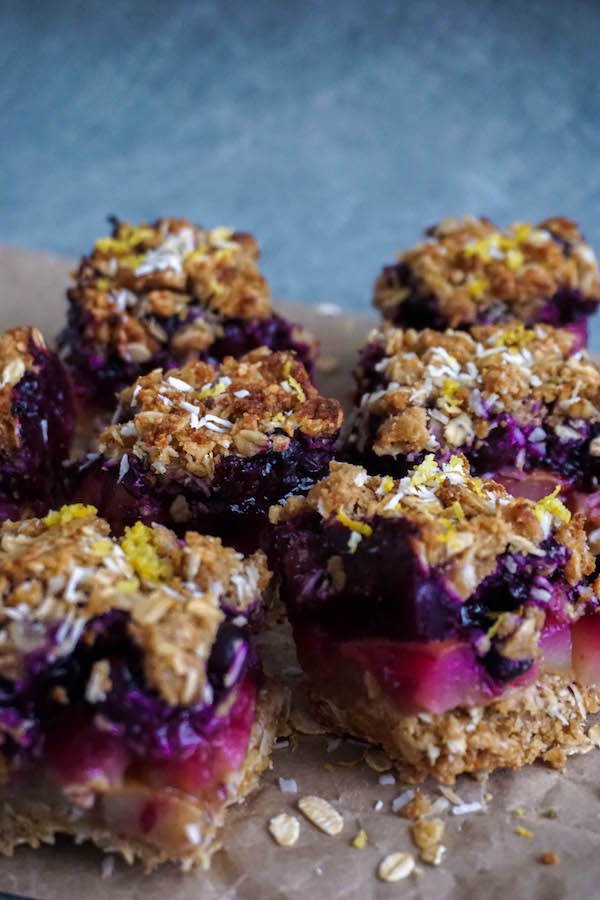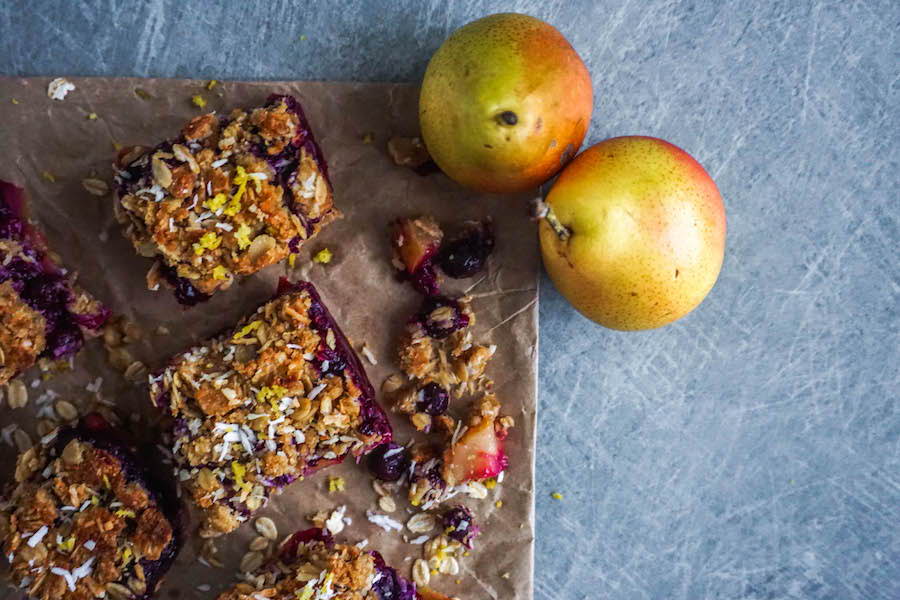 These Crumble Bars are all about using seasonal fruits so feel free to sub out the pears or blueberries for whatever you have an abundance of, or use frozen versions like I did with the blueberries.