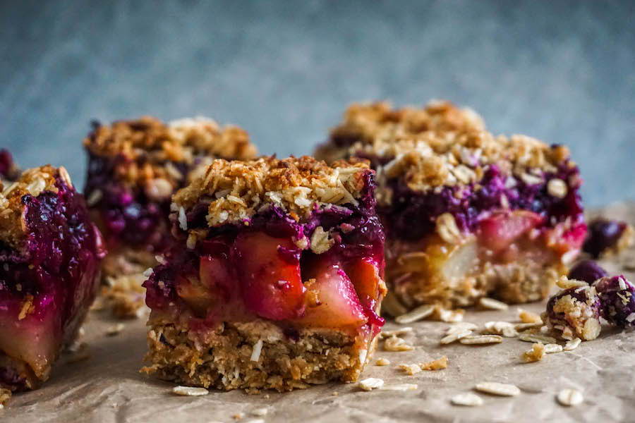 These Pear and Blueberry Crumble Bars are a magical mix of sweet stewed fruits and crispy, zesty oats.